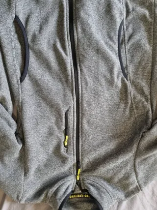 Forro polar de color gris con detalles en negro y cremallera. - Tejido jaspeado. - Bolsillos laterales. - Bolsillo frontal con cremallera.