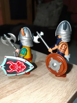 Dos figuras de guerreros vikingos de Playmobil. - Incluyen cascos con cuernos. - Uno lleva armadura y el otro atuendo tribal. - Accesorios como hacha, espada y escudos.