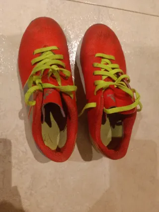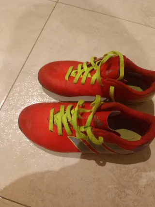 Botas de fútbol Adidas en color rojo y con cordones verdes. - Talla 33. - Diseño deportivo con detalles grises.
