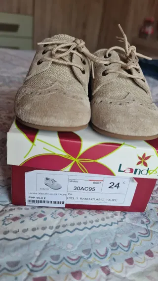 Preciosos zapatitos unisex de la marca Landos, de piel en color taupe, talla 24. No se llegaron a usar ni dos horas, se ve en la foto como están las suelas. De regalo unos calcetines a juego. - Marca Landos. - Material piel. - Color taupe.