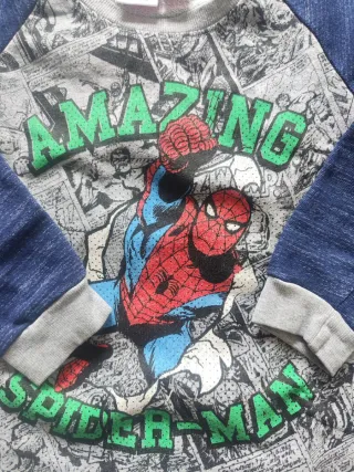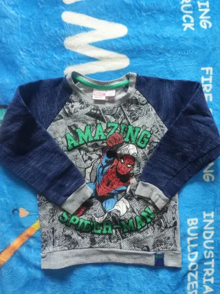 Sudadera infantil con diseño de Spiderman. Talla 5-6 - Estampado frontal de Spiderman en acción. - Texto AMAZING SPIDER-MAN en verde. - Mangas raglán en azul marino. - Cuello redondo con ribete verde.
