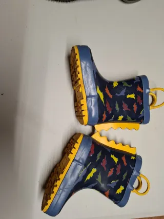 Botas de agua para niño con un divertido estampado de dinosaurios. Perfectas para días de lluvia. - Diseño azul con dinosaurios multicolores. - Suela de goma antideslizante. - Tiradores laterales para facilitar su puesta.