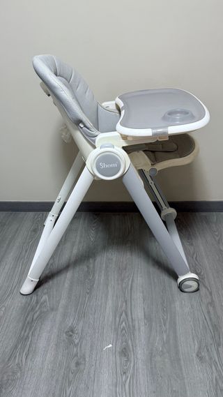 Trona de la marca Shom en color gris, ideal para las comidas de los más pequeños. Se encuentra en muy buen estado. - Asiento acolchado. - Bandeja extraíble. - Arnés de seguridad. - Ruedas para facilitar el movimiento.