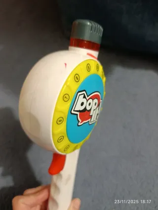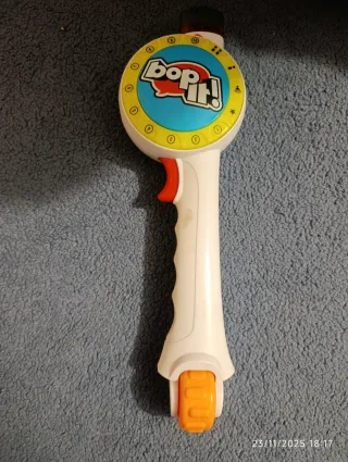 Juego electrónico Bop It! con diseño divertido y colorido. - Mango blanco con detalles en naranja y rojo. - Disco superior con el logo Bop It!. - Rueda giratoria en la base.
