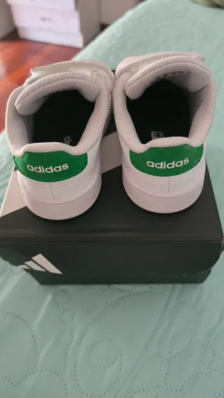 Zapatos deportivos Adidas para bebé, talla 20. Han sido usados una sola vez, por lo que se encuentran en perfecto estado. - Cierre de velcro. - Diseño blanco con detalles verdes. - Suela de goma.