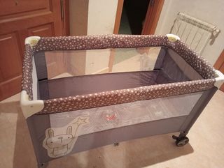 Cuna de viaje plegable con estampado de estrellas y conejitos. - Laterales de malla transpirable. - Estructura resistente. - Ruedas para facilitar el transporte.