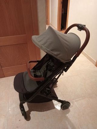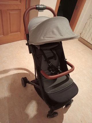 Silla de paseo de la marca Jane, con un diseño moderno y funcional. - Color gris y detalles en marrón. - Capota para proteger del sol. - Arnés de seguridad. - Barra delantera. - Ruedas para facilitar el movimiento.