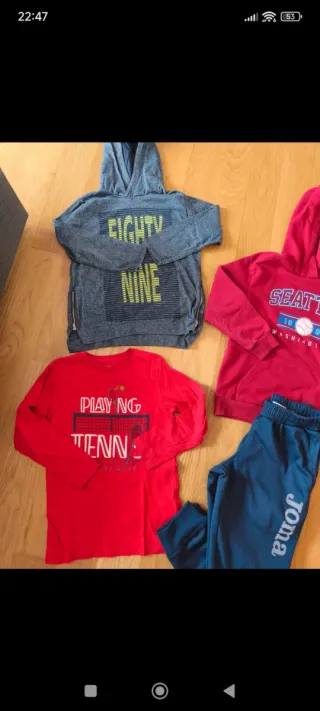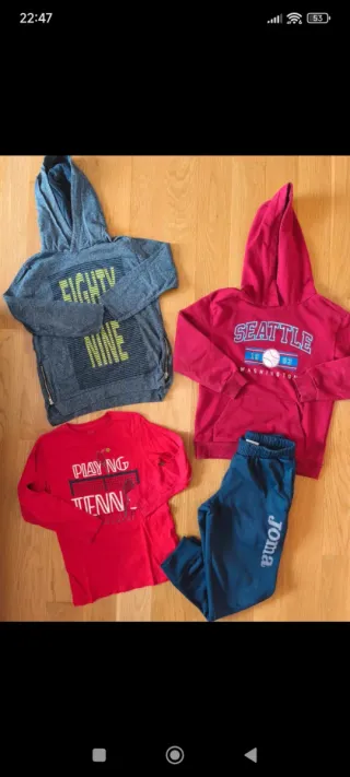 Lote de ropa para niño de 6 años. - Sudadera gris con cremalleras laterales y estampado EIGHTY NINE. - Sudadera roja con capucha y estampado SEATTLE WASHINGTON. - Camiseta roja de manga larga con estampado PLAY NG TENN. - Pantalón deportivo azul marino con logo Joma. Todo en perfecto estado