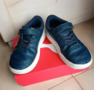 Zapatillas deportivas Puma para niño en talla 26. Cierre de velcro y cordones. - Color azul marino. - Suela blanca. - Detalle de perforaciones en la puntera.
