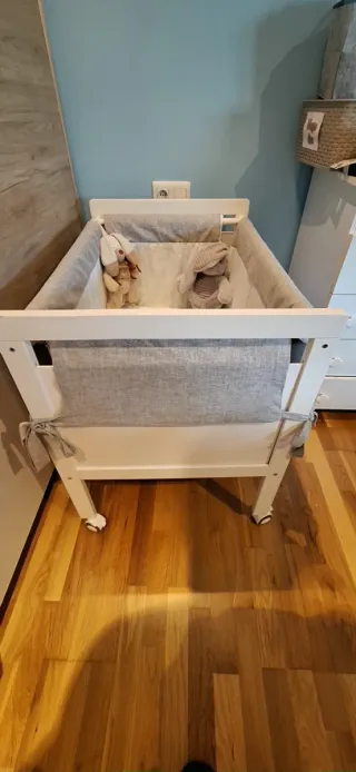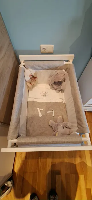 Minicuna de madera blanca con textiles grises. - Estructura de madera. - Textiles de tela. Se vende con vestiduras. - colchon de espuma -62 ancho x 90 largo x 80 alto
