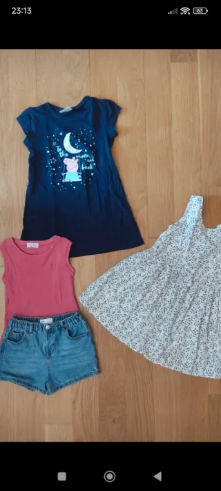 Conjunto de ropa de verano para niña de la marca Zara, talla 4 años. Lote ropa verano niña talla 104 cm Dos vestidos y conjuntonde shorts y camiseta, varias marcas, zara, hym, lupilu... #loteropaveranoniña4años #ropaveranoniña4años #zarakids4ans #zarakidsfille #lote50activado - Vestido azul marino con estampado de Peppa Pig y luna. - Camiseta rosa de tirantes. - Pantalón corto vaquero.