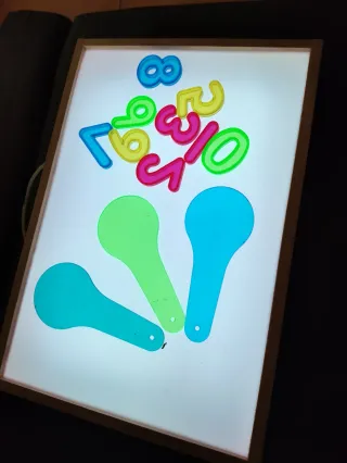 Mesa de luz con accesorios para aprender y jugar. - Incluye números de colores (1, 2, 3, 6, 8, 10). - Incluye tres palas de colores (verde y azul). - Ideal para actividades educativas.