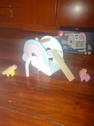 Juego de peluquería para unicornios. Incluye varios accesorios para jugar a lavar y secar el pelo a los 4 unicornios, como secadora, rampa, cepillo para el pelo, casita con puerta y columpio.