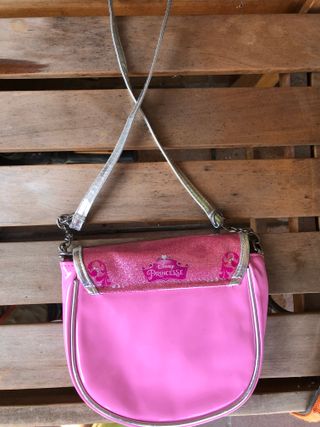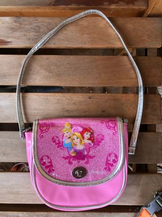 Bolso infantil con diseño de princesas de Disney. Es de color rosa brillante y tiene un asa plateada. - Estampado de princesas. - Cierre de giro. - Ribete plateado.