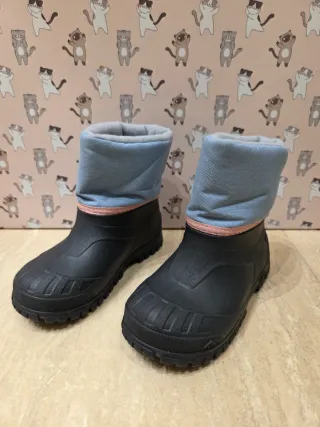 Botas de agua o nieve en talla 32/33. Son ideales para mantener los pies secos y calientes. - Parte superior de tela azul con ribete azul. - Suela de goma negra. - Forro interior negro.