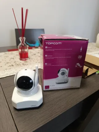 Cámara vigila bebés Topcom KS-4250 en color blanco. Ideal para supervisar a los más pequeños. - Diseño compacto y moderno. - Antena para conexión Wi-Fi. - Base giratoria.