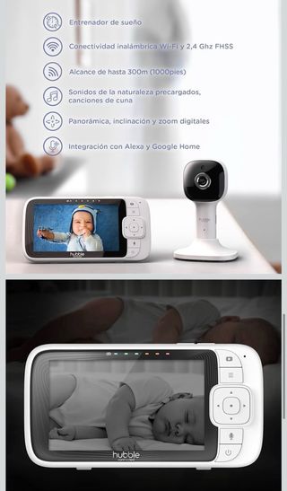 Sistema de vigilancia para bebés Hubble Nursery Pal Cloud. Incluye monitor y cámara. - Pantalla HD de 5 pulgadas. - Visión nocturna por infrarrojos. - Luz de noche de 7 colores. - Reconocimiento de voz y temperatura.