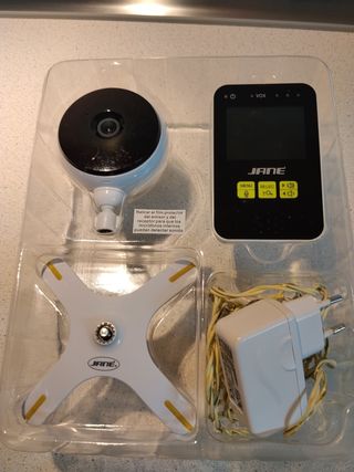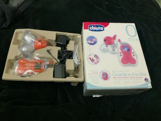 Sistema de vigilancia para bebés de la marca Chicco, compuesto por una unidad de cámara y una unidad de monitor. - Unidad de cámara con visión nocturna. - Unidad de monitor con pantalla. - Incluye adaptadores de corriente. Ya tiene 8 años, la batería del monitor dura poco pero funciona perfectamente