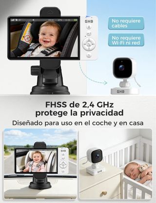 Vigilabebés GHB de 5 pulgadas con cámara para coche. Permite monitorizar al bebé de forma inalámbrica. - Pantalla IPS de 720P. - Conexión inalámbrica. - Incluye soporte para coche.