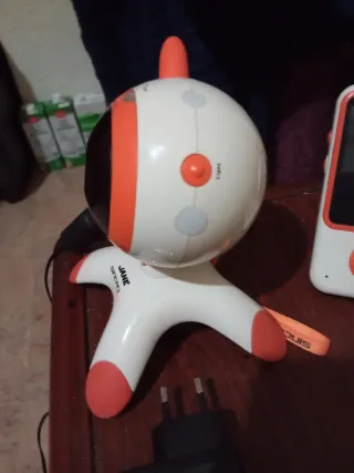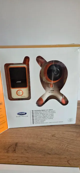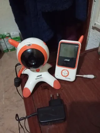 Sistema de vigilancia para bebés de la marca Jane. - Incluye unidad del bebé (cámara) y unidad de los padres (monitor). - Diseño blanco y naranja. - Adaptador de corriente incluido.Precio algo negociable