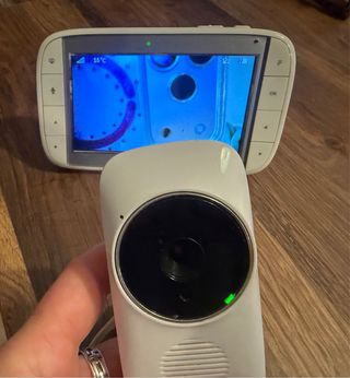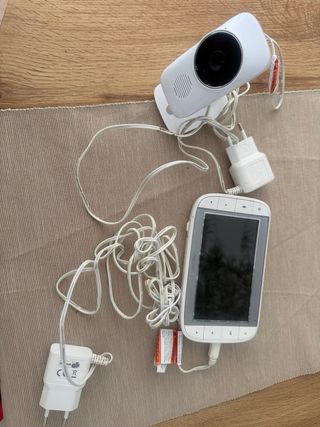 Vigilabebés Motorola MBP482 con cámara y pantalla. - Diseño moderno y compacto. - Incluye adaptadores de corriente. La pata de la cámara está rota y la batería del monitor aguanta poco pero enchufado funciona perfectamente
