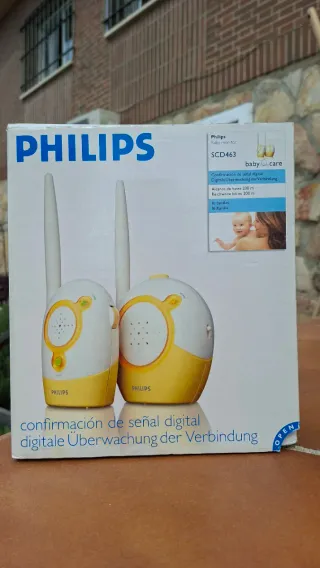 Vigilabebés Philips SCD463 con dos unidades. Buen estado de conservación, caja original y todos los manuales de uso. Confirmación de señal digital, 16 canales y alcance de 200 metros.