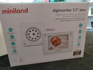 Vigilabebe MINILAND 3.5 PLUS. En muy buen estado, utilizado en dos ocasiones. * Gran calidad de imagen. * Alcance 240 metros. * Bidireccional, puedes escuchar y hablar con el bebé. * 4 canales para conectar hasta 4 cámaras. * Recibe alertas si el bebé se despierta. * Zoom de 4 posiciones. * Alerta de tomas, luz para que el bebé no se sienta solo, y 5 melodías distintas. * Lo puedes conectar a la televisión y al ordenador. * Es compatible con cámara digital plus. * Tiene su bolsa para transportar. .......... Si precio original es de 235€ lo vendo por 70€ no envío ni hago cambios.
