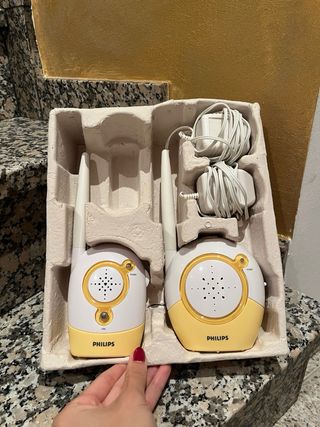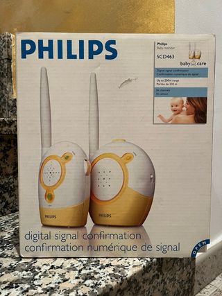Monitores de audio para vigilar a tu bebé. Vigilabebés Philips modelo SCD463 Baby Care. Estado de conservación muy bueno, están muy bien cuidados. Dispone de la caja original y todos los manuales de uso. Dispone de confirmación de señal digital, 16 canales y un alcance de 200 metros. Permite tener vigilado a tu bebé y escuchar remotamente los sonidos producidos por el niño o niña.