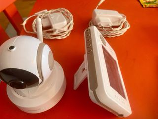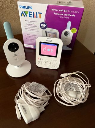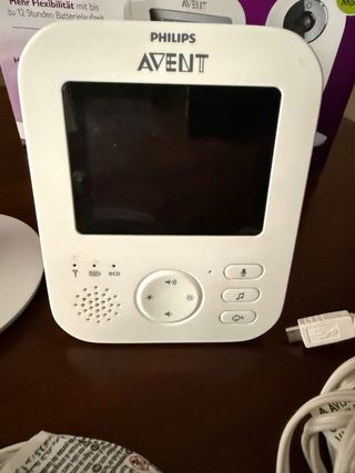 Sistema de vigilancia para bebés Philips Avent. - Incluye unidad para padres con pantalla de 8,8cm (3,5") gran nitidez, visión nocturna clara, y batería con buena duración. Pequeña muesca que no afecta al funcionamiento. - Modo vox para apagar pantalla y activarse con ruido del bebé. - Incluye unidad para bebé con cámara. Se puede activar luz tenue y reproducir música relajante para el bebé. - Dos adaptadores de corriente.