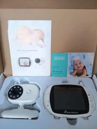 Sistema de vigilancia digital para bebés de la marca BOIFUN. Incluye cámara y monitor. - Cámara con visión nocturna. - Monitor con pantalla a color. - Conexión inalámbrica.