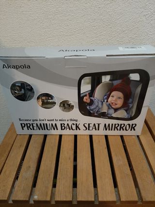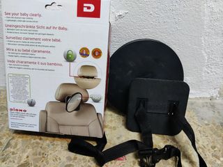 Espejo vigilabebes para el coche. Una herramienta buenisima para conducir solo con tu bebe y observarlo tranquilamente. Se sujeta al reposa cabezas trasero y es orientable 360°. Cuando se regula, se aprieta con una mariposa, muy seguro. Vendo porque me regalaron 2. Se uso 1 vez.