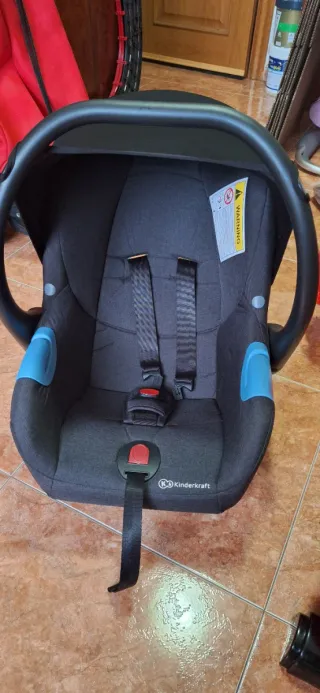 Silla de coche para bebé de la marca Kinderkraft. Diseñada para la seguridad y comodidad. - Color gris oscuro con detalles en azul. - Incluye arnés de seguridad de 5 puntos. - Capota protectora. - Asa de transporte. - Marca: Kinderkraft.