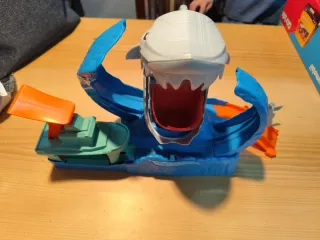 Pista de juego Hot Wheels con temática de tiburón.
