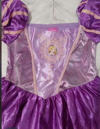 Disfraz de la princesa Rapunzel de Disney, inspirado en la película. -para niña 5/6 años - Vestido morado brillante. - Mangas abullonadas. - Detalle de corazones y ornamentos dorados en la falda. - Estampado de Rapunzel en el pecho.