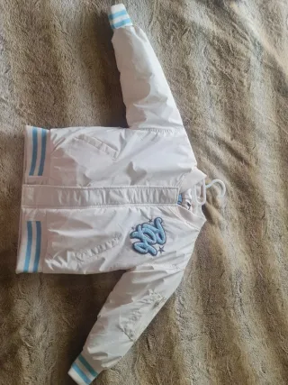 Chaqueta infantil de color blanco con un diseño moderno y detalles en azul. - Mangas largas con puños elásticos. - Cuello redondo. - Cierre de cremallera. - Bolsillos laterales. - Adorno bordado en el pecho.