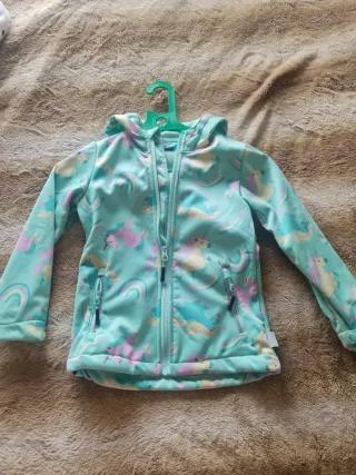 Chaqueta con capucha para niña, con un divertido estampado. - Diseño de unicornios y arcoíris. - Color principal turquesa. - Cierre de cremallera frontal. - Dos bolsillos con cremallera.