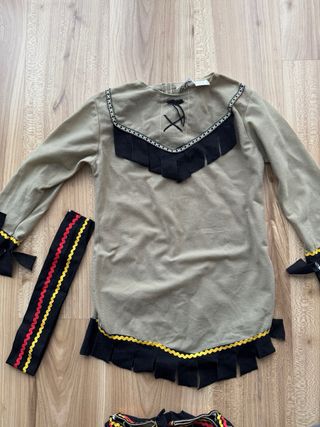 Disfraz de india para niña o niño, talla M. Incluye vestido y polainas. - Vestido de manga larga con detalles de flecos negros y amarillos. - Cinturón con diseño de zigzag en rojo y amarillo con velcro. - Polainas a juego con flecos. B30