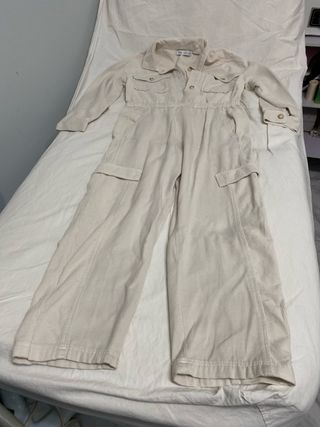 Mono largo de pana fina en color beige de la marca Zara. - Cierre de botones en la parte delantera. - Cintura elástica. - Bolsillos en el pecho y en los laterales. - Puños abotonados.