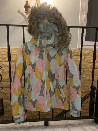 Chaqueta de la marca Roxy para niña con un divertido estampado de hojas en tonos pastel y mostaza. Cuenta con capucha con pelo sintético. - Diseño con estampado de hojas. - Capucha con pelo sintético.