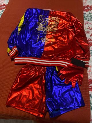 Conjunto de disfraz inspirado en Harley Quinn para niña. - Chaqueta con cremallera frontal. - Pantalón corto. - Guantes a juego. - Diseño bicolor rojo y azul. - Detalles de rayas blancas y amarillas.