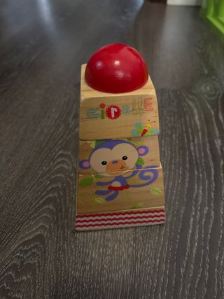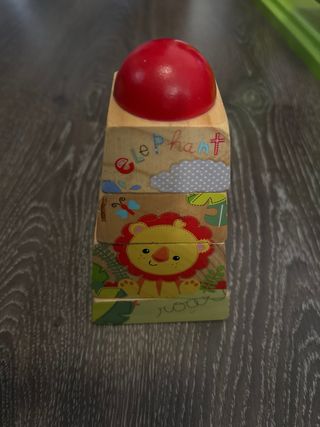 Juguete de construcción de madera con diseño de animales. - Piezas de madera con ilustraciones. - Diseño de mono, jirafa, elefante y león. - Tapa superior en forma de cúpula roja.