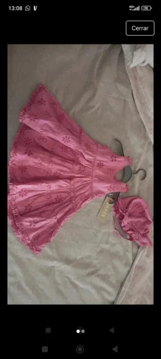 Conjunto de vestido y gorro a juego en color rosa, con delicados bordados florales. - Vestido con volantes y bordados. - Incluye gorro a juego. - Marca: Baker