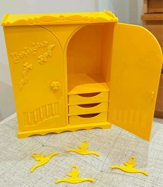 Conjunto de muebles para muñecas Barriguitas. - Cuna amarilla con colchón y almohadas. - Minicuna amarilla con detalles de volantes. - Armario amarillo con puertas y cajones. - Perchas amarillas.