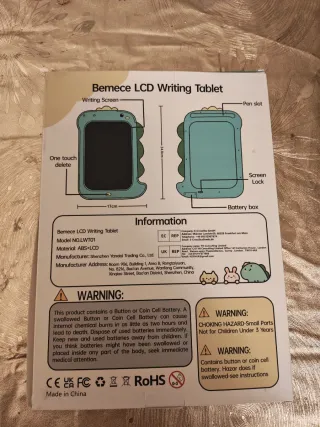 Tableta de escritura LCD de 8.5 pulgadas con diseño de dinosaurio. - Pantalla LCD. - Edad recomendada: 3+ años. - Fabricado en China.