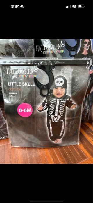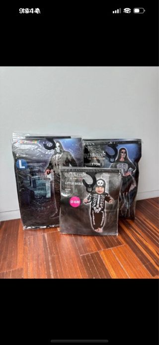 Pack de disfraces familares de esqueleto compuesto por: Disfraz mama mujer Talla L consta de vestido( no incluye las medias) Disfraz papá hombre Talla L consta de túnica con capucha y careta Disfraz bebé niño niña consta de mono con capucha talla 0-6 meses 50-70cm Usados un solo dia con alguna marquitas de uso
