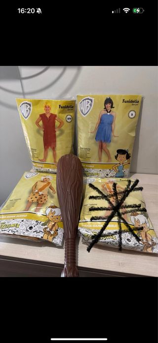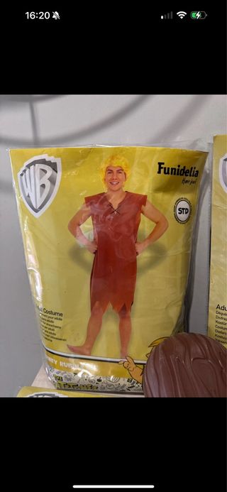 Disfraz familia Marmol de los picapiedra consta de tres disfraces: - Disfraz mama Betty Talla S vestido y peluca - Disfraz Papá Pablo Talla Standar vestido y peluca -Disfraz bam bam 1-2 años culetin camiseta y diadema peluca Estan como nuevos un solo uso. Regalo garrote por el lote