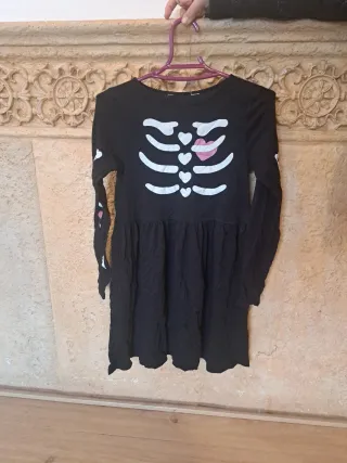 Disfraz de esqueleto para niña, ideal para Halloween o fiestas temáticas. - Diseño de esqueleto blanco sobre fondo negro. - Incluye un detalle de corazón rosa en el pecho y en las mangas. - Manga larga y falda con vuelo.