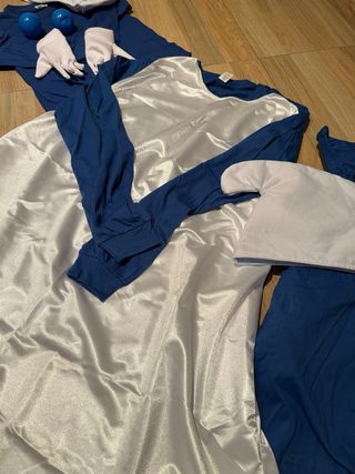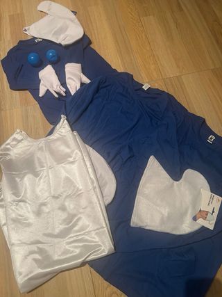 Conjunto de disfraces para toda la familia con temática de Pitufos. Incluye varios elementos para recrear los personajes. - 3 Gorros blancos. - 1 par de guantes blancos. - 1 medias azules. - 2 colitas azules. - 3 camisetas azules. - 1 vestido blanco. Para 2 adultos talla L y un niño marca talla 7-8 pero a partir de 6 años está bien.
