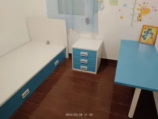 Habitación infantil con cama y cajones.