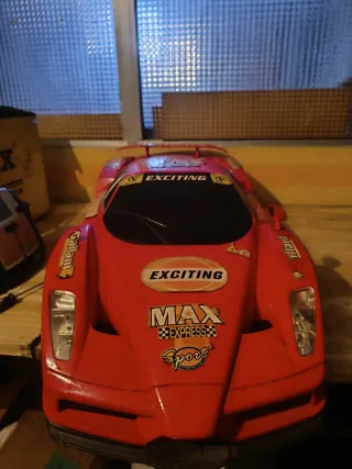Coche de radiocontrol con un diseño deportivo y llamativo. - Color rojo brillante. - Decoración con pegatinas de competición. - Incluye mando a distancia. - No comprobado si funciona, falta el cargador de la batería. - Batería incluida - medidas largo 75cm ancho 32cm